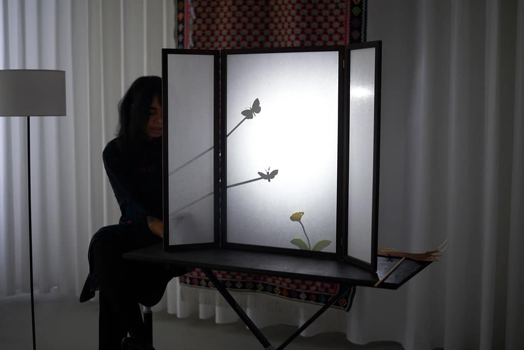 This is the second performance in a series I call Shadow Install, which are shadow plays which arc towards parables. They utilize the silhouettes behind a backlit screen in dialogue & action, which usually leads to drama. Die Butterfly Die, or The Butterfly The, is a meditation on life in the midst of so much death, natural & unnatural, logical & illogical during our time. It is about the interconnectedness of fates as sentient beings. As a brief intermission between two acts, I will be reading a bit of my own poetry. Om mani padme hum.
