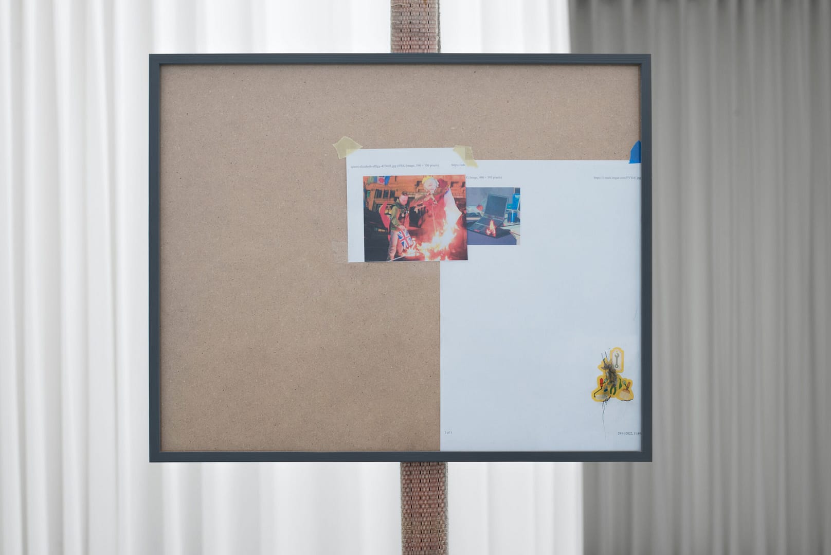 Competition is transformed/thumb/burning laptop, 2022 Pencil on paper, inkjet prints, tape, frame. 610 x 510 (mm)