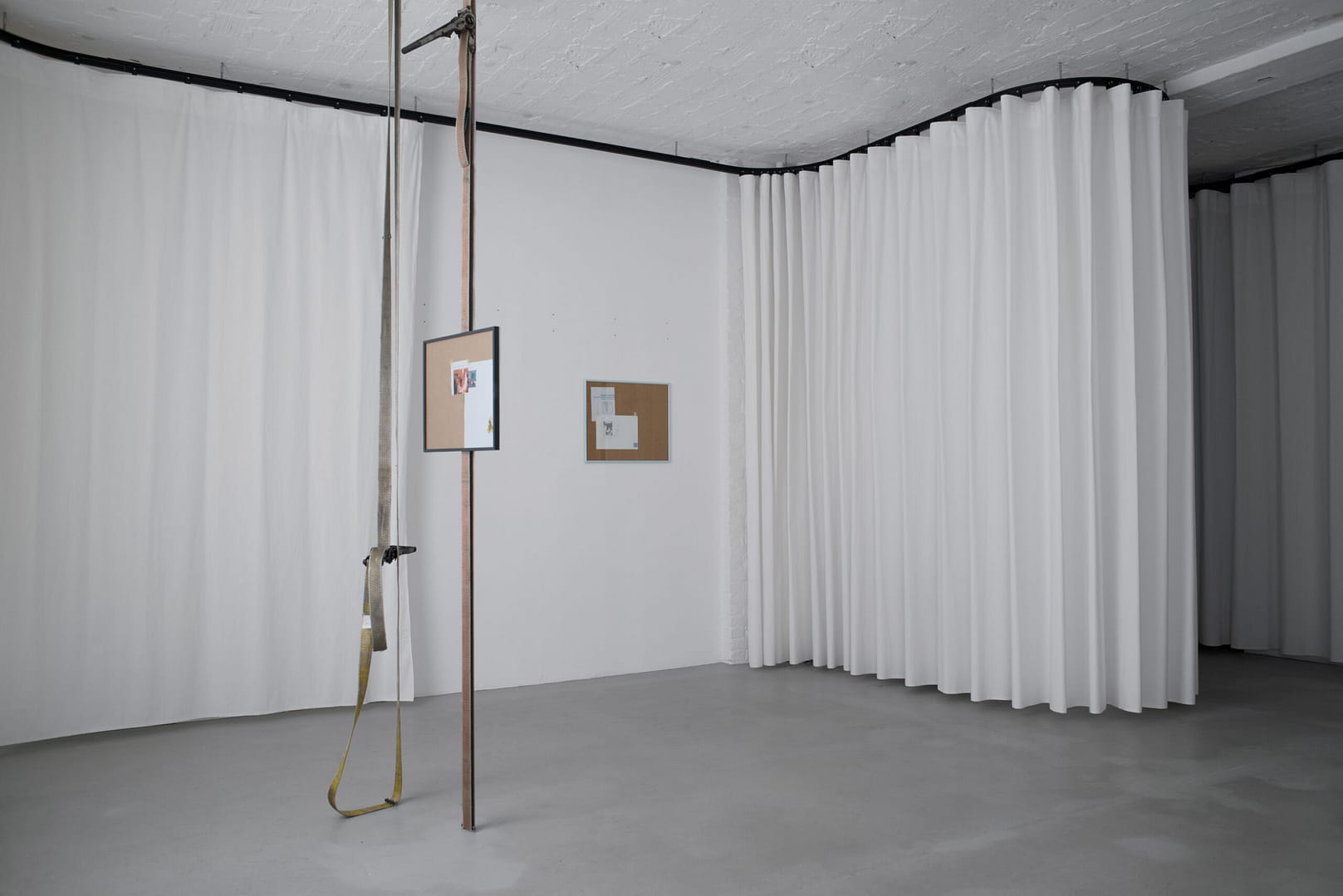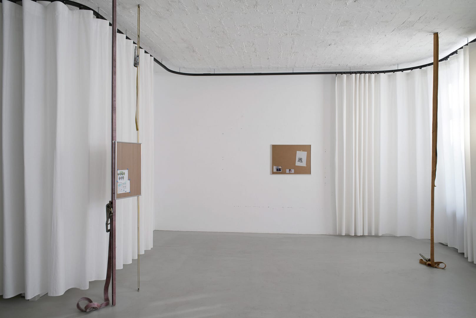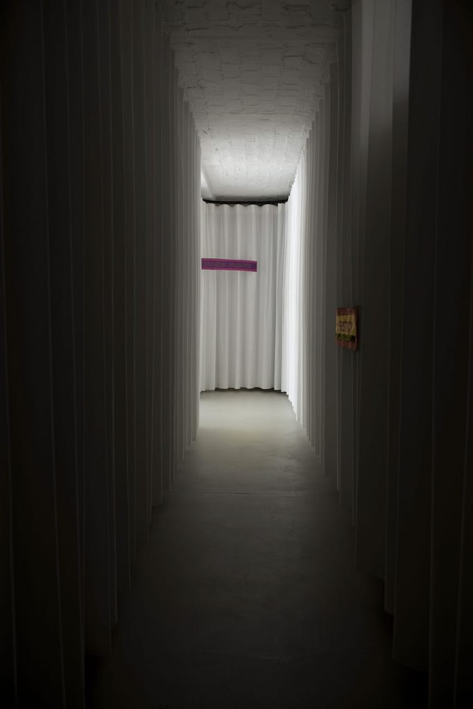 The exhibition INFORMATION AND DRINKS presents a series of words materialized through carefully sewn textile pieces. What might look as empty slogans could be the preparatory structure on which a narration could grow.