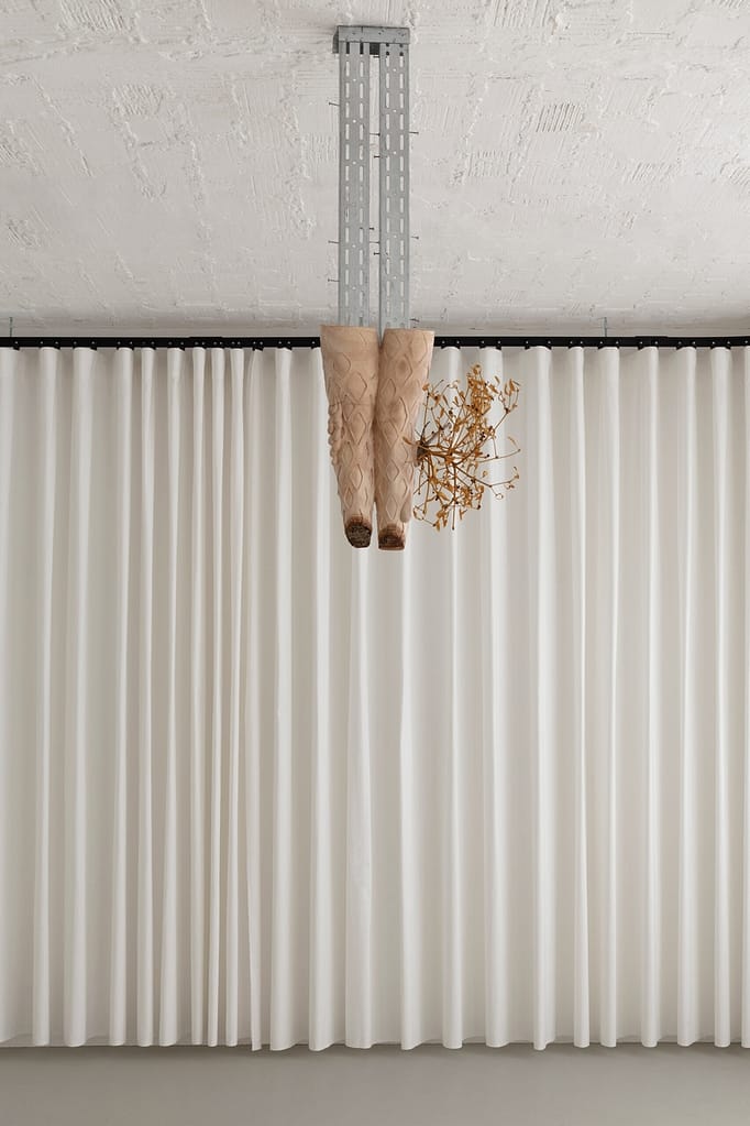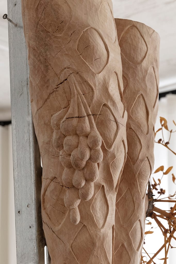 Face Down in a Ditch, limewood, mistletoe, found fixings, 2022