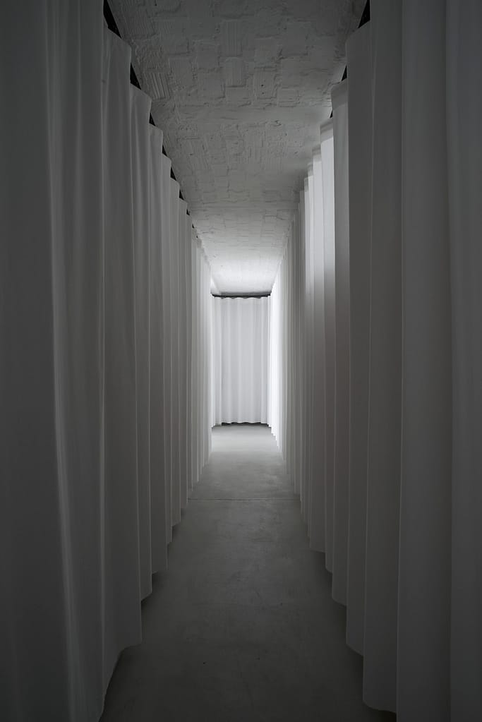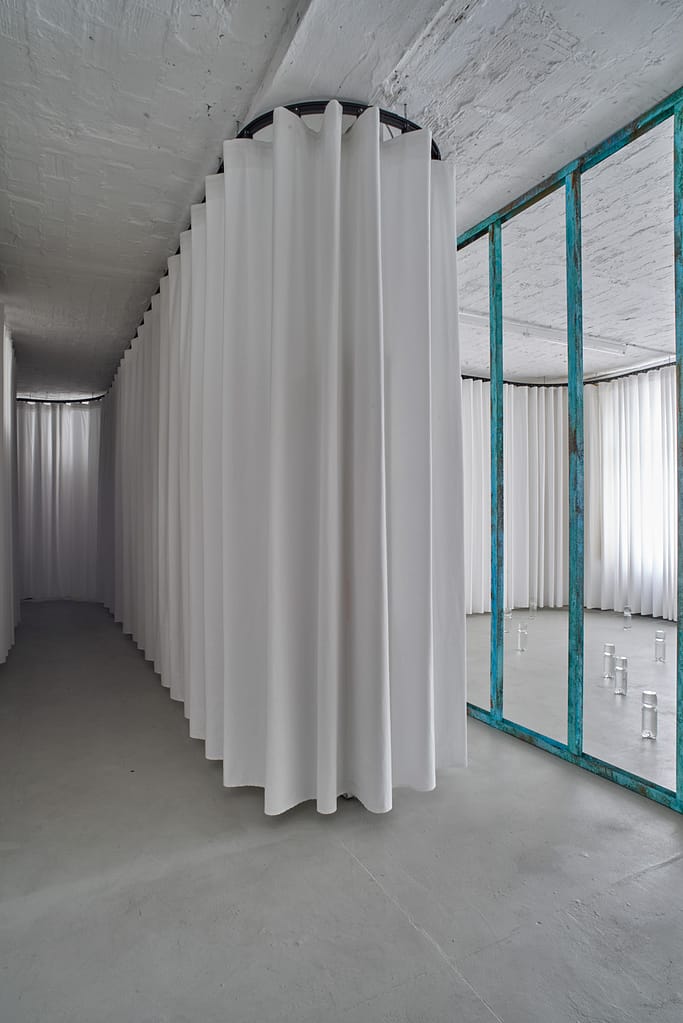 To frame the scenery, the artist draws a copper barrier called “drop shadow” whose dissolution -corroded by water- has already begun.